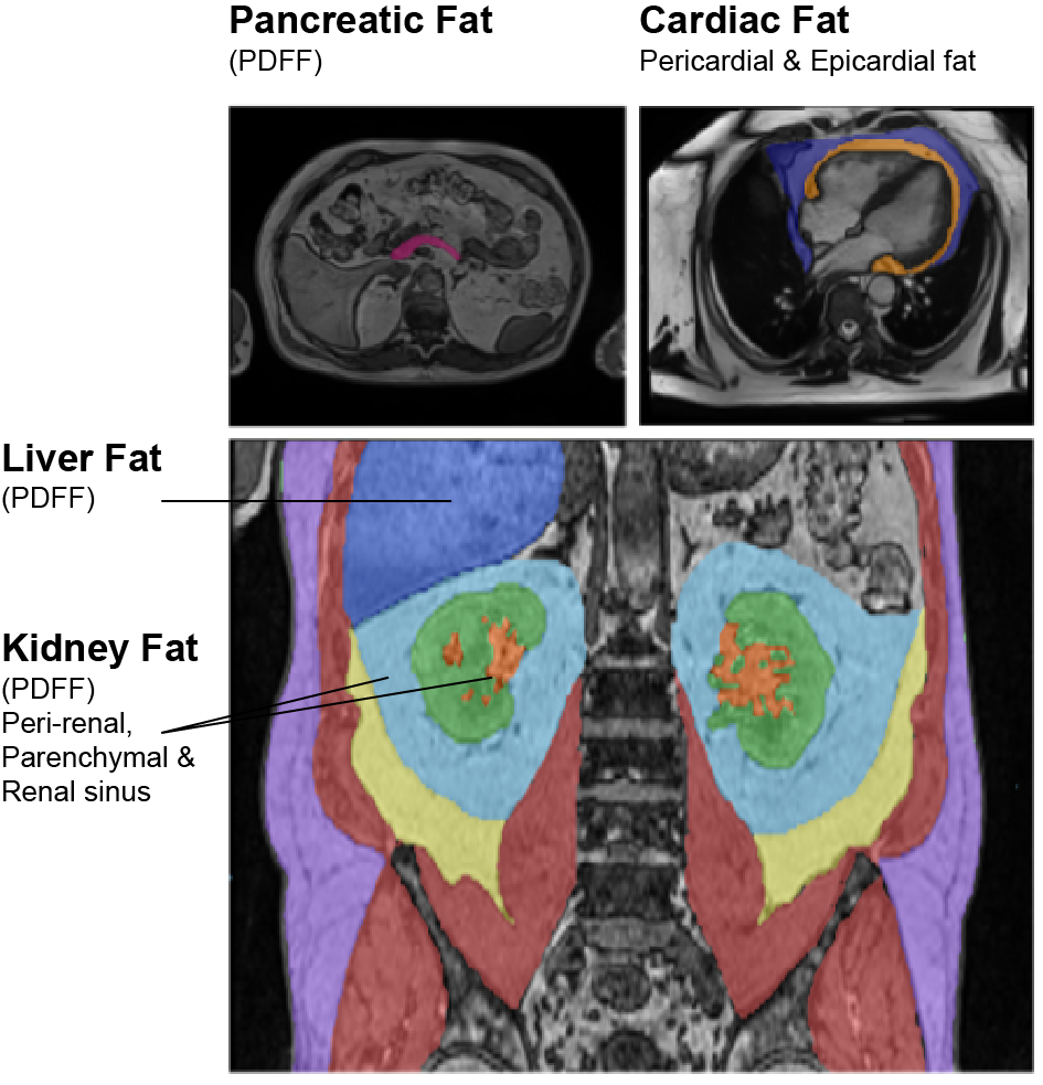 We provide neck-to-knee MRI body composition metrics including visceral (VAT) and subcutaneous adipose tissue (SAT), lean tissue volume, skeletal muscle volume and index, muscle fat infiltration (MFI), and suspected brown adipose tissue (sBAT).